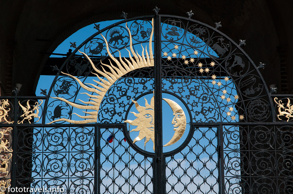 Во-первых, точная дата постройки башни неизвестна, а с ее возведением связано несколько красивых, хотя и весьма печальных легенд. Пересказывать, а точнее копировать их из интернета смысла особого не вижу. Часть учёных датирует башню XVII—XVIII веками, некоторые — относят строительство башни ко второй половине XVI века, другие — и вовсе к периоду Казанского ханства (то есть до 1552 года). Во-вторых, башня уникальна тем, что расположена совершенно отдельно от крепостных стен, что совершенно не соответствует сложившимся традициям строительства кремлей. В-третьих, башня достаточно сильно наклонена (сегодня уклон к северо-западу составляет около 2 метров). То есть башня находится в славной компании “падающих” башен вместе с например Пизанской. На распашных воротах изображены солнце и луна.